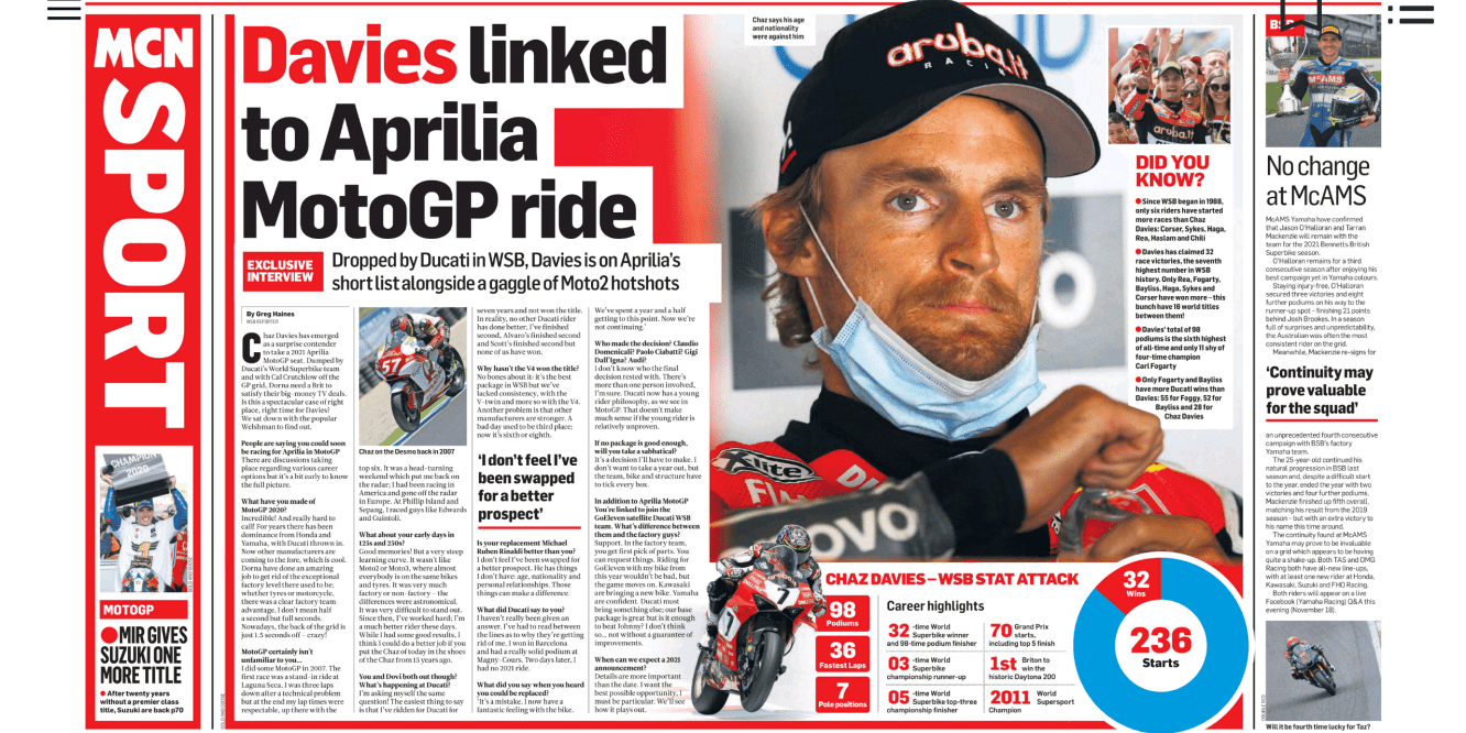 In an exclusive interview for this week’s Motorcycle News (available in UK shops every Wednesday), Greg is chatting with 32-time World Superbike race winner Chaz Davies.