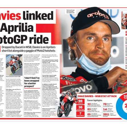 Greg chats with multiple World Superbike race winner Chaz Davies about being dropped from Ducati after seven years with no apparent explanation. There’s also strong rumours of the Welshman picking … Continue reading Davies: “I haven’t been given an answer”